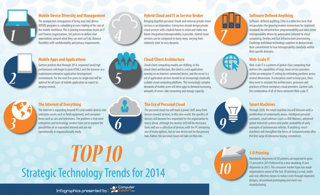 Mobile and cloud hosting services are moving technology in new directions in 2014, as an infographic from ComputerSupport.com points out. Based on a report presented by Gartner at the Gartner Symposium/IT Expo, the infographic reveals ten clear strategic technology trends impacting businesses and consumers in 2014.