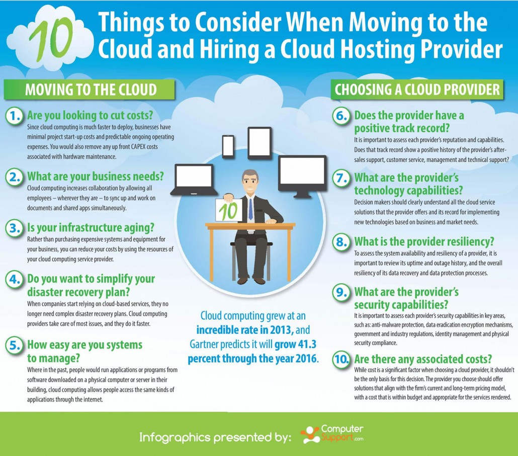 As businesses continue the global migration to cloud, veterans of the field are learning from past successes and failures. A new infographic from ComputerSupport.com aims to help businesses as they search for a cloud hosting provider. Here are the ten major things companies should keep in mind: